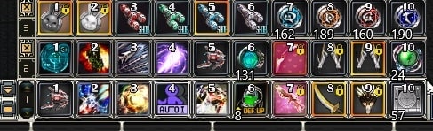 Functional icons (skills, forces, actions, items) can be configured by drag and drop for later use using F1-F10 hotkeys. Up to five sets of item belts are available each of wihich can be set with hotkeys by clicking the arrow button to the left of the belts. Press the TAB button to skip to the next set of item belt.