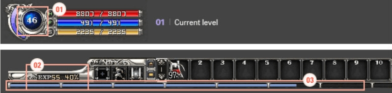 03 | When converting the currency level experience into 100%, each unit slot represent 10% and the sky blue gauge inside each slot indicates 1%.