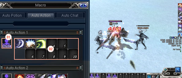 Automatic action is a macro system in which you can configure all the actions (skills, forces, using items, and etc.) involved in RF Online. You can configure up to three groups of automatic action macros, each having at most 10 actions.It will run no matter what once you click the shortcut to automatic action after checking for delays. You can put any skill, force, and most items in these slots.