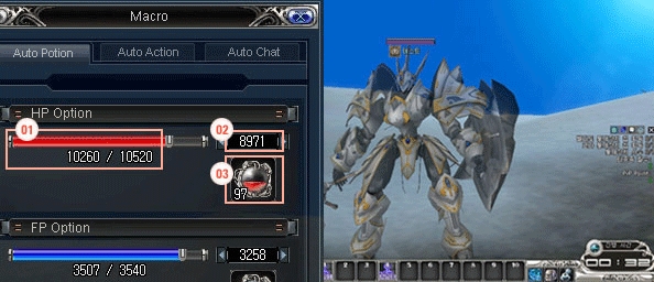 Automatic Potion is a macro system of which you can configure the settings so that you can automatically consume the three basic potions (HP / FP / SP) used in RF Online. The automatic potion function will not work when the particular potion has run out in your inventory.
