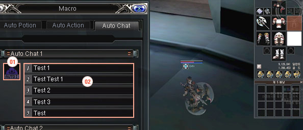 Automatic chat is a convenient function that comes handy for repetitive or sequential chats. You can use up to two groups of automatic chatting, each with at most five types of chatting. The chatting space is shared by all players. Please abide by the common manners and etiquettes.