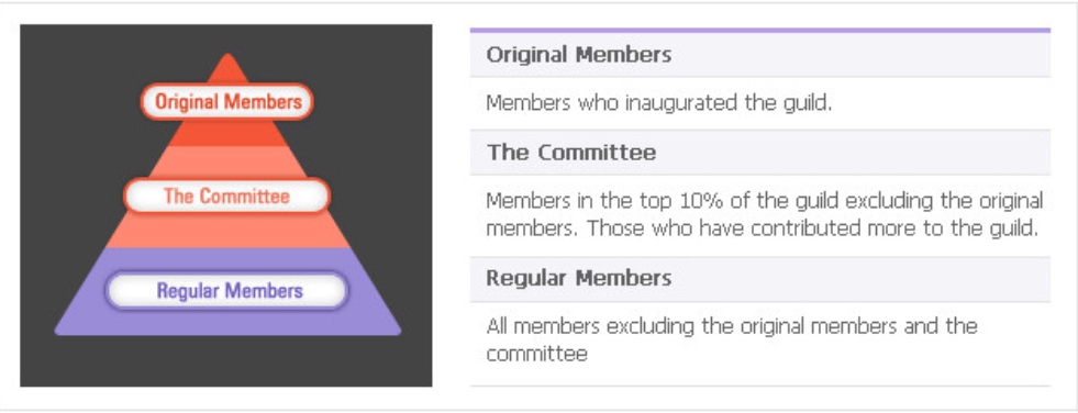 Beside original members, there exists a committee in a guild for making decisions. The committee may be formed by the top 10% of the members excluding the original members and have identical rights as the original members. (members of the committee are subject to change accoding to guild contribution points). The number of committee members will change with the size of the guild but will always consist of at least one.