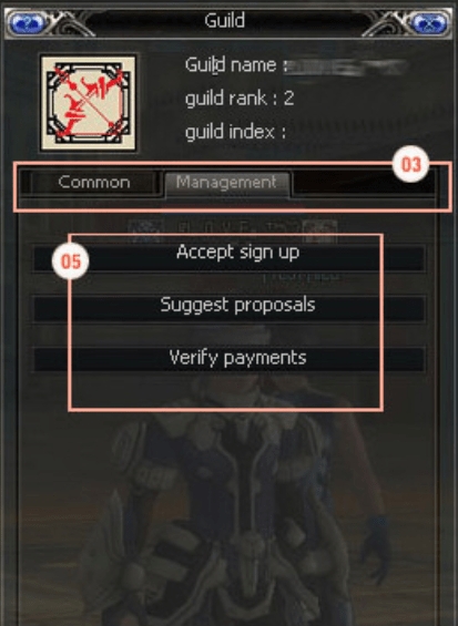 Only the guild members with decision making rights may use this menu (original members founder). A. Accept sign up: determine the acceptance of players who requested for sign up. B. Suggest proposals: suggest a proposal to the guild