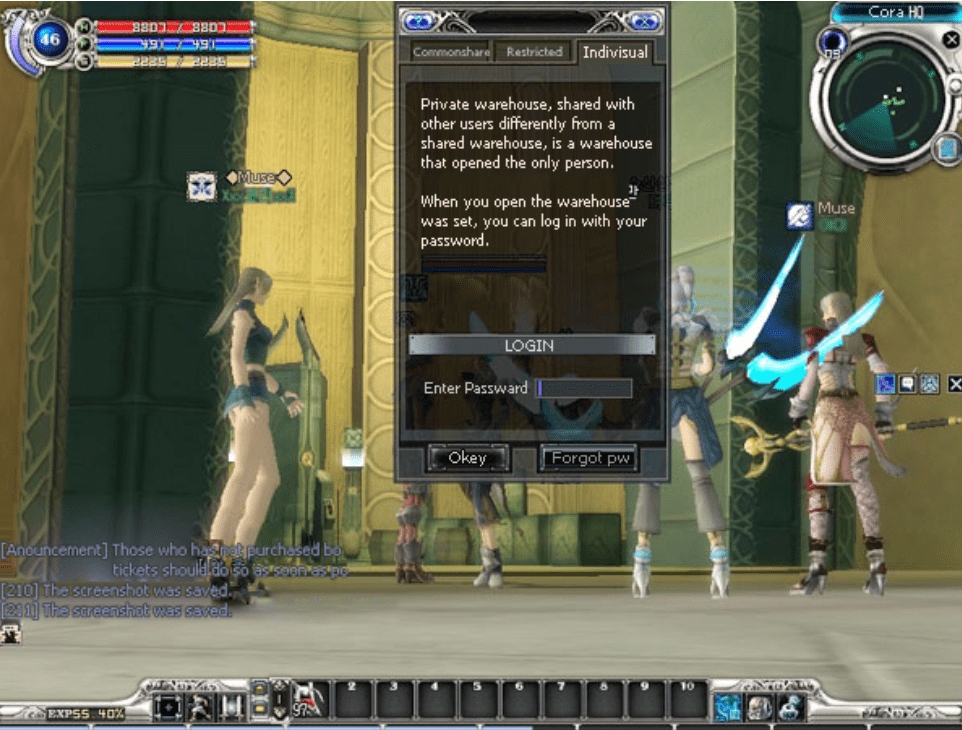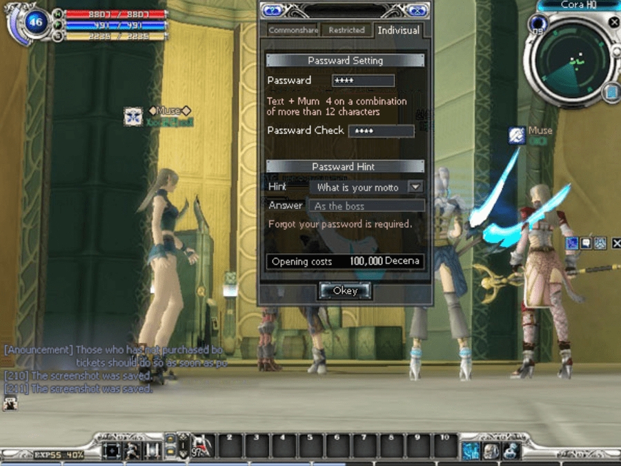 Go to the “Coin Exchange / Bank” NPC located at the HQ of each race and select [Create Inventory]. At first, you need to pay a certain amount of money (100,000 as of current) to open one inventory (20 slots). You are required to set a password and a hint for the password.