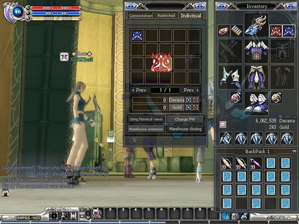 An interface just like the usual inventory interface will appear after going through the personal identification process. Use drag & drop to move items in and out of the inventory. No fees are incurred for storing items in the inventory but you will have to pay 5% the cost of any item you wish to redeem from the inventory. (No fees are applied for depositing/withdrawing game money (gold, money).