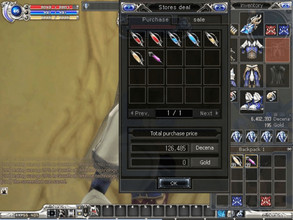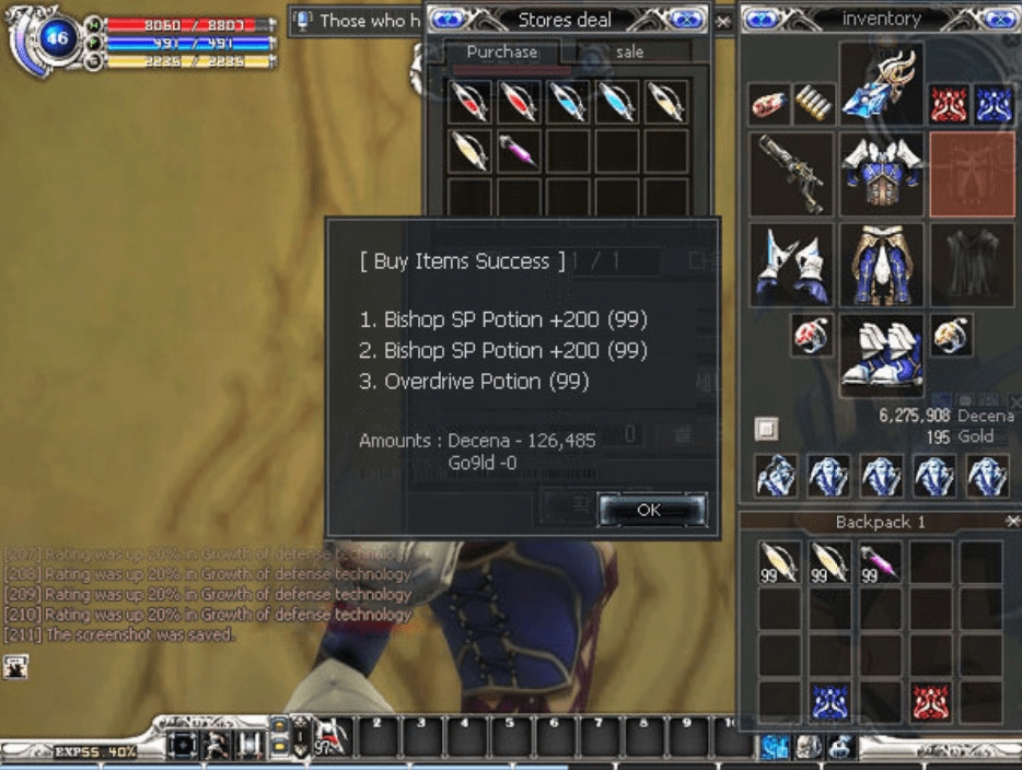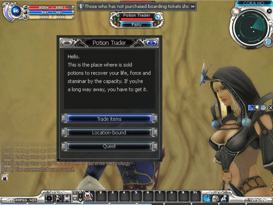 Adventures such as hunting or inter-racial battles require consumable items such as potions or ammunitions. Merchant NPCs provide such accommodations. You should always carry with you items that will protect you.