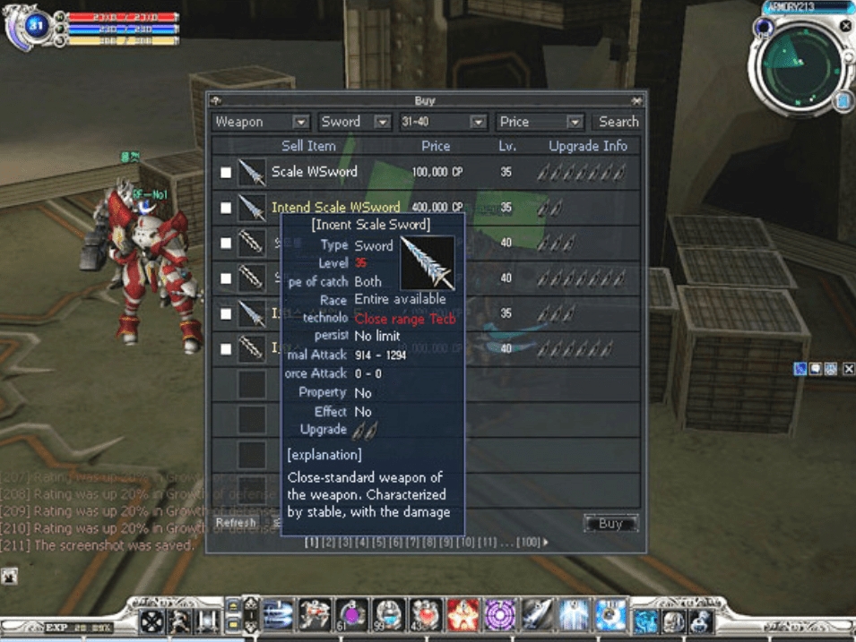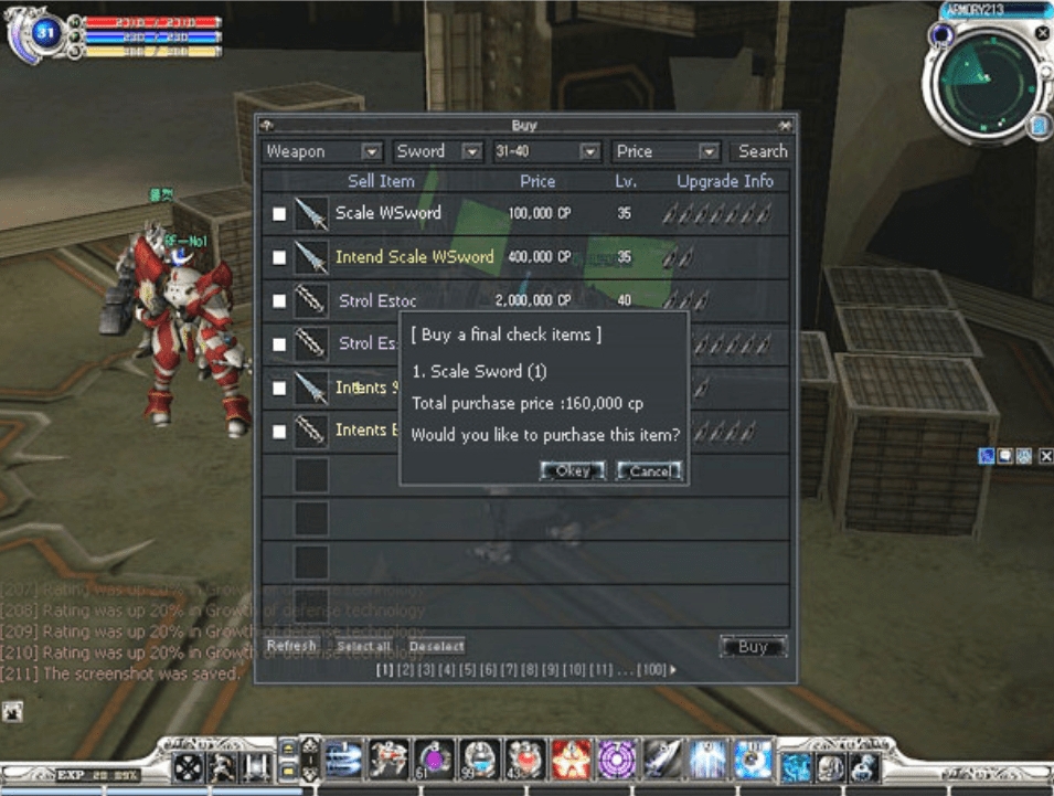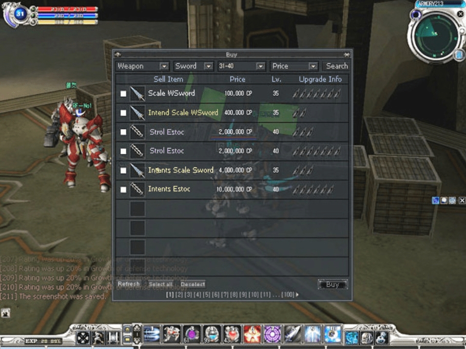 Select [Buy Item] at the auction / Auto trade system, which will display categories for searching registered items. Select the category of an item you want to buy and click the [Select] button and then you will see a list of items under that category.